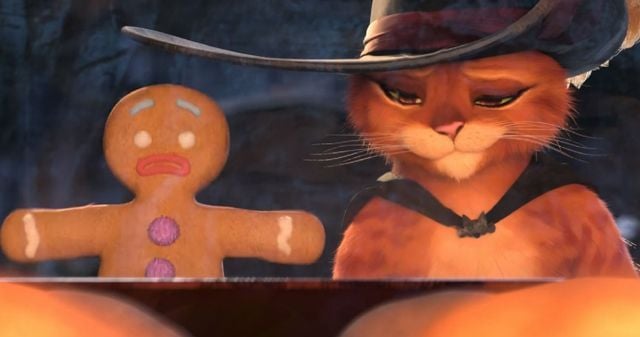 Não apenas no filme, mas o principal trailer de Gato de Botas 2 apresenta a contagem das mortes do protagonista felino. Quase em um estilo macabro e animado da franquia Premonição, uma dessas sequências apresenta o Gato e o Homem-Biscoito cozinhando em um forno gigante. Descuidados, os dois abrem a porta da máquina e são consumidos por um fogaréu intenso. Levando em consideração as outras participações do personagem de Shrek, ele também sobreviveu ao acidente.