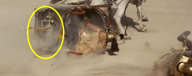 Do lado esquerdo da tela, quando paramos o filme no momento certo, podemos notar as solas de um par de tênis usado por um técnico, aparentemente ajoelhado dentro da carruagem, bem ao lado do ator que a pilota. Difícil manter o foco na ação da cena quando se percebe tamanha falha! Mas isso não é tudo.