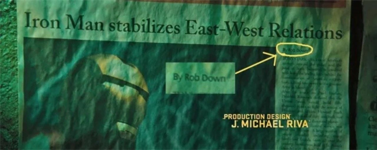 Se você pausar em 4 minutos e 26 segundos, verá que, entre os créditos iniciais, aparece uma matéria sobre o super-herói assinada por um tal Rob Down. Ora, não é preciso ir mais longe para entender que se trata do próprio Robert Downey Jr., intérprete de Tony Stark. É uma forma de homenagear o ator que deu início ao fenômeno que se desenvolve até hoje. Mas é tão pequeno que você provavelmente precisará prestar muita atenção para notá-lo: