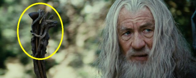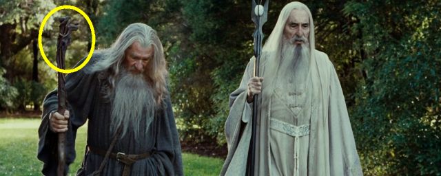 Em nossa opinião, uma das melhores sequências para ver esse easter egg se encontra aos 47 minutos e 34 segundos de filme (na versão extendida), quando Gandalf e Saruman caminham pelas vielas de Isengard, evocando juntos o destino da Terra Média. Em seguida, pause no momento certo e observe com atenção as ramificações da madeira que coroam o bastão do Mágico.