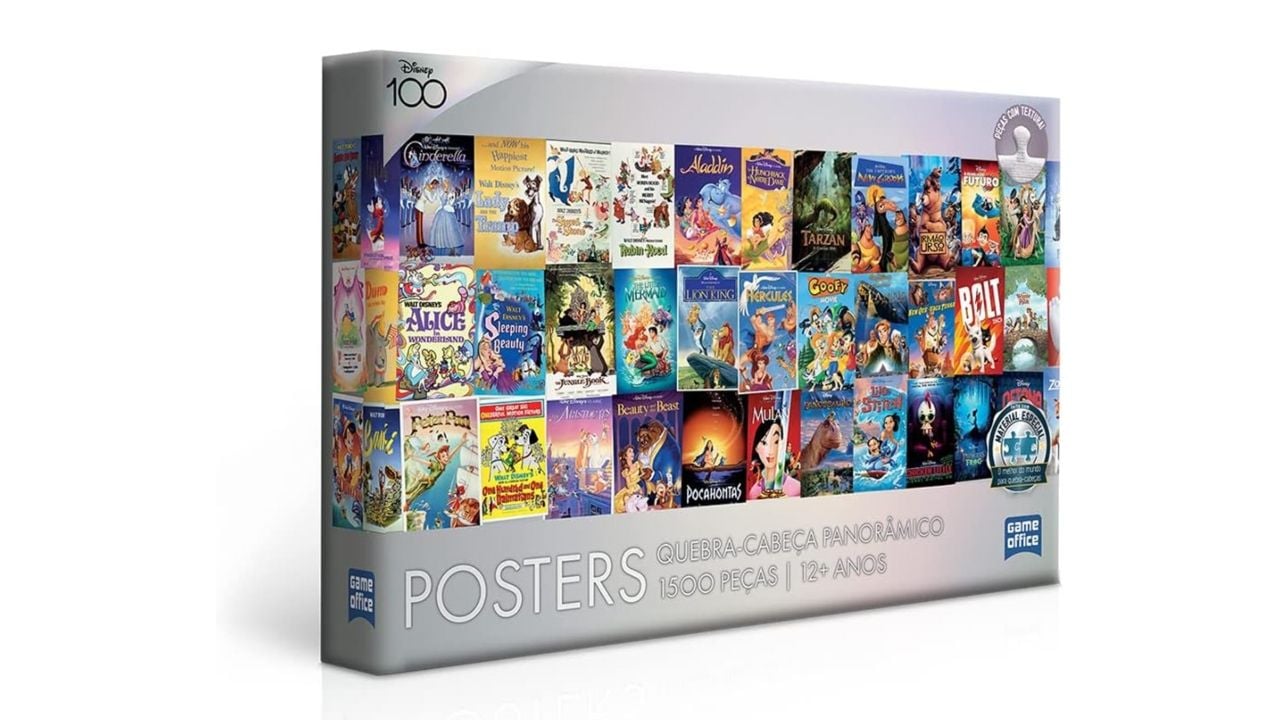 Prepare-se para uma jornada mágica pelos mundos da Disney com esse quebra-cabeça panorâmico de 1500 peças com coleção de posters icônicos de filmes que marcaram gerações! Reúna amigos e família, mergulhe na nostalgia e reviva os momentos mais inesquecíveis dos filmes Disney enquanto monta essa obra de arte. Uma homenagem aos contos encantados que nos cativaram por um século, este quebra-cabeça é o presente perfeito para os fãs de todas as idades! Encontre na Amazon por R$ 113,21.