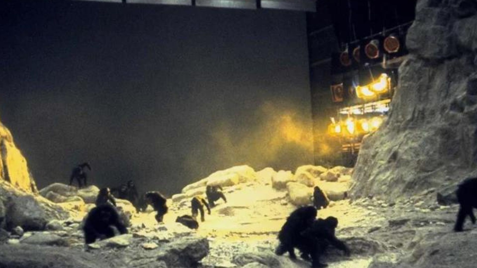 Há apenas uma tomada de um homem-macaco filmada ao ar livre: o icônico osso lançado para o céu, filmado em um estacionamento do estúdio, o restante da cena aconteceu através de uma projeção frontal em uma escala nunca antes vista.