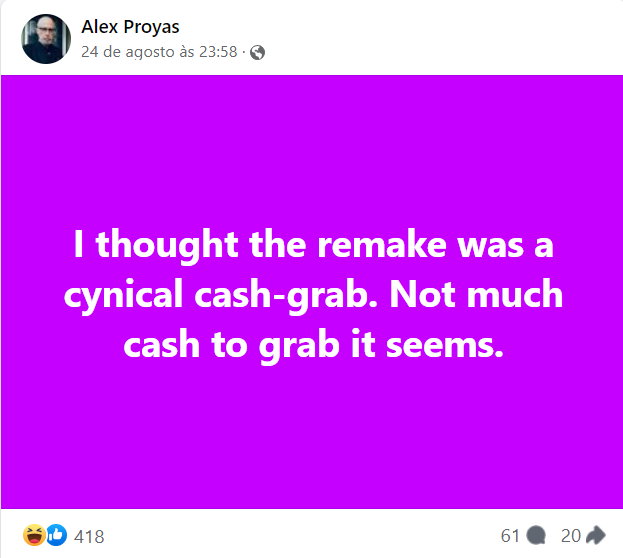 “Eu pensava que o remake era uma cínica tentativa de ganhar dinheiro. Pelo que parece, não há muito dinheiro para ganhar", completou.