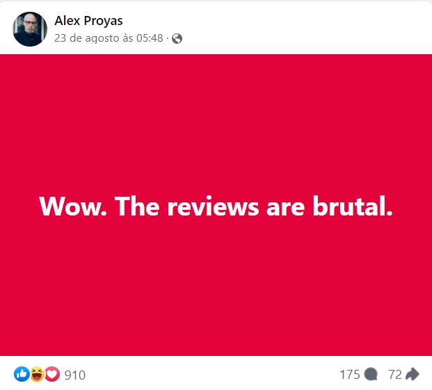 Desta forma, Alex Proyas, diretor do original de 1994, foi ao Facebook para tirar sarro do reboot, comemorando o fiasco. Para se ter ideia, O Corvo (2024) configura um dos maiores prejuízos do ano, angariando - até o momento - meros 4,6 milhões de dólares - enquanto conta com um orçamento estimado em 50 milhões.