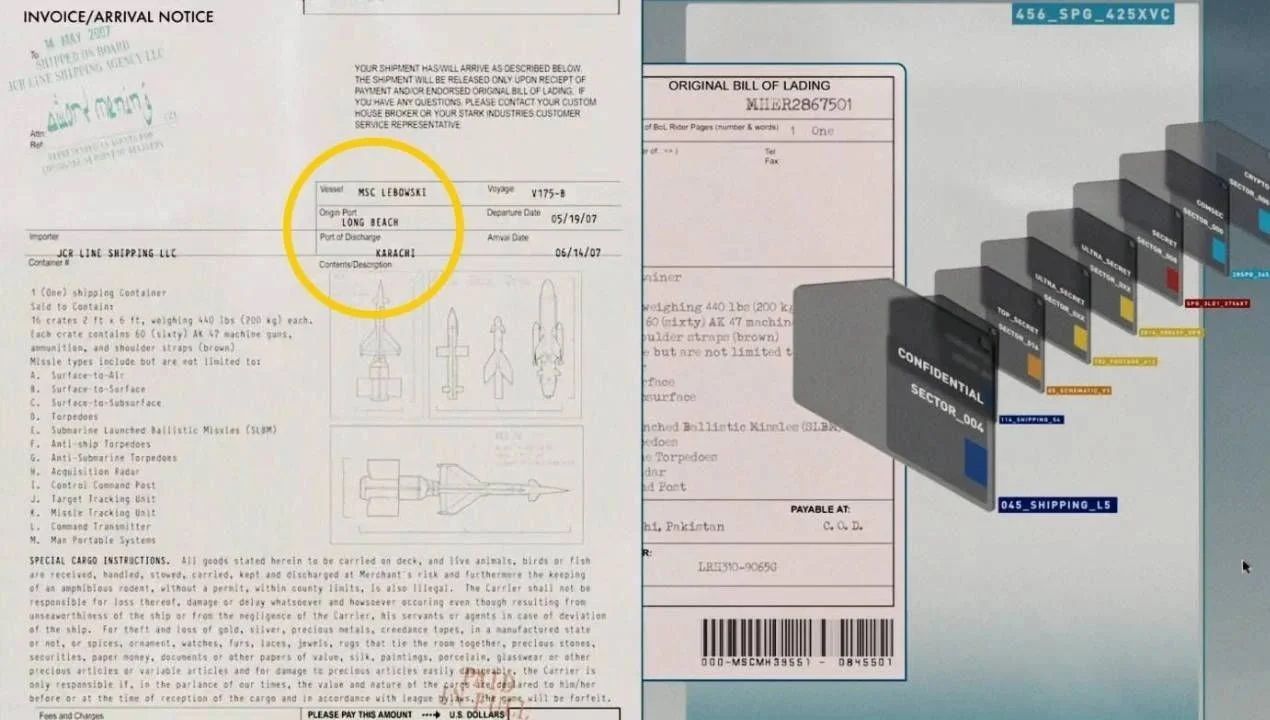 A nova série da Marvel vai trazer de volta um vilão que não víamos há quase 20 anosHá uma referência semelhante no filme de abertura do MCU: Homem de Ferro, no qual Robert Downey Jr. assumiu seu papel característico de Tony Stark pela primeira vez. Há uma cena em que a secretária e futura parceira de Stark, Pepper Potts (Gwyneth Paltrow), se infiltra no escritório do vilão Obadiah Shane (Jeff Bridges) para vasculhar seu computador em busca de arquivos confidenciais e relatórios sobre remessas ilegais de armas. Durante sua pesquisa, ela se depara com um disco rígido secreto que, entre outras coisas, contem informações sobre um navio chamado “MSC Lebowski”.