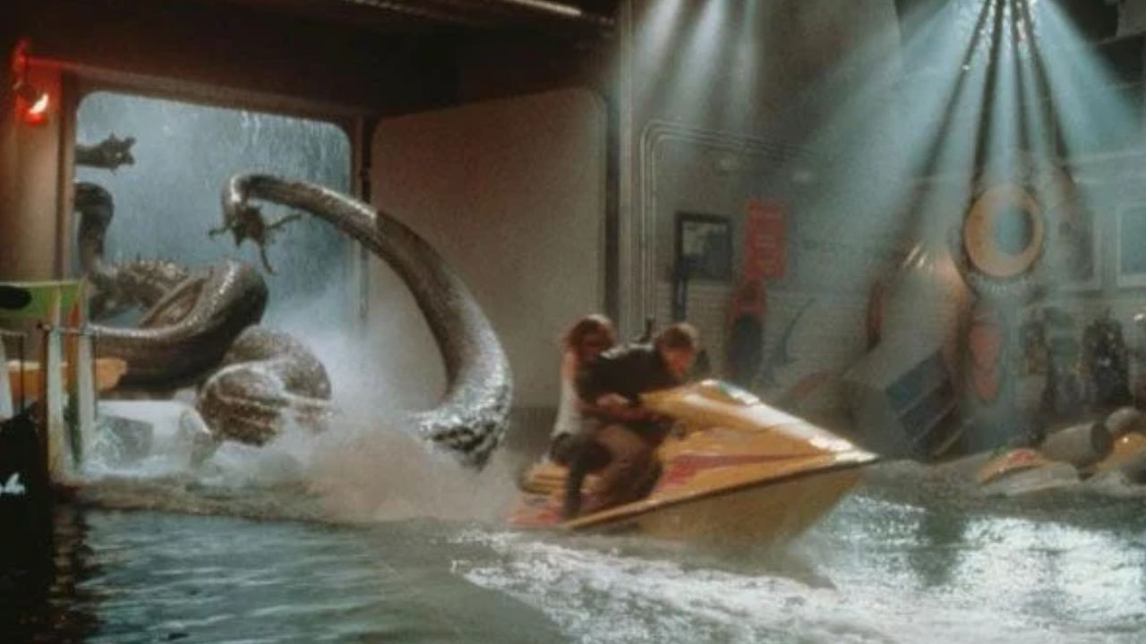 Ao chegarem ao fundo do navio, eles fazem uma descoberta terrível: tudo está coberto de restos humanos por todo lado, como comida regurgitada. Após emergirem com sucesso do primeiro confronto cara a cara com a criatura — embora ainda não a vejamos — os protagonistas se reúnem em um compartimento para teorizar sobre o que aconteceu; algo essencial em um filme cafona sobre monstros. Aqui descobrimos, em uma reviravolta muito louca, que o dono do navio de cruzeiro está em conluio com Hanover, o líder dos mercenários.