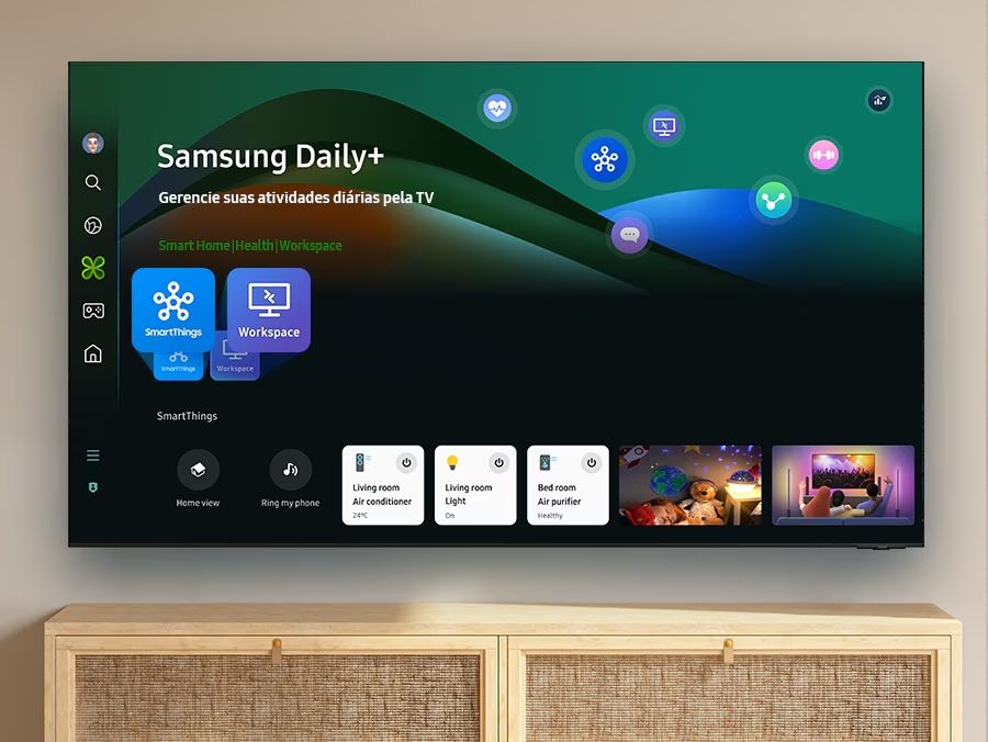 Além disso, o modelo conta com recursos modernos como o Gaming Hub, ideal para quem joga na nuvem ou em consoles, e integração com assistentes de voz como Alexa e Bixby. A TV também traz suporte ao Apple AirPlay e conectividade por meio de Wi-Fi, Bluetooth e entradas HDMI, USB.