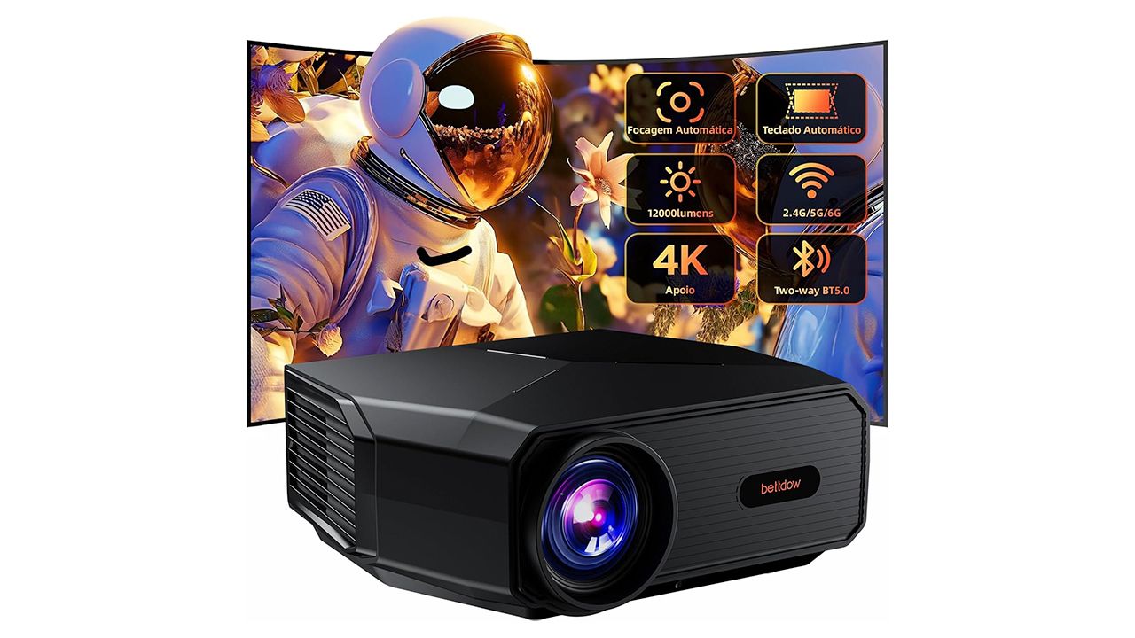 Modelo mais acessível, o projetor Bettdow AC1038 oferece resolução nativa Full HD com compatibilidade para 4K, brilho de 12000 lúmens e projeção de até 250 polegadas. Conta com foco automático e correção trapezoidal, além de Wi-Fi 6 e alto-falantes Hi-Fi integrados. É ideal para quem busca qualidade sem gastar muito.