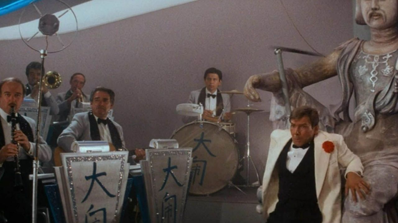 Em busca do antídoto, Harrison Ford precisa se defender de todos os tipos de ataques – incluindo ser atingido com pequenos machados pelos capangas do gângster. Indy se abaixa, impotente, diante de uma estátua chinesa, ao lado da qual uma banda é claramente visível, ainda tocando e imperturbável pelos acontecimentos.