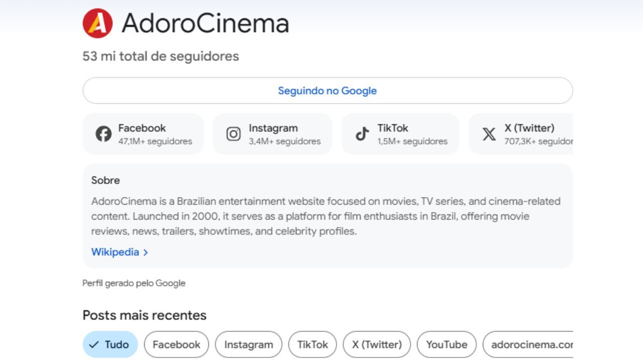 Seguindo todas as tendências do momento, o AdoroCinema também tem uma página própria no Google, onde reúne não apenas as publicações de outras plataformas, como também agrupa as notícias recentes publicadas no site. Caso o portal apareça com frequência nas sugestões da plataforma de buscas, é possível que muitos já tenham visto o botão para seguir o perfil no Discover. Para quem ainda não encontrou a estrada de tijolos amarelos, basta entrar neste link e apertar no botão "seguir" na parte superior da página.