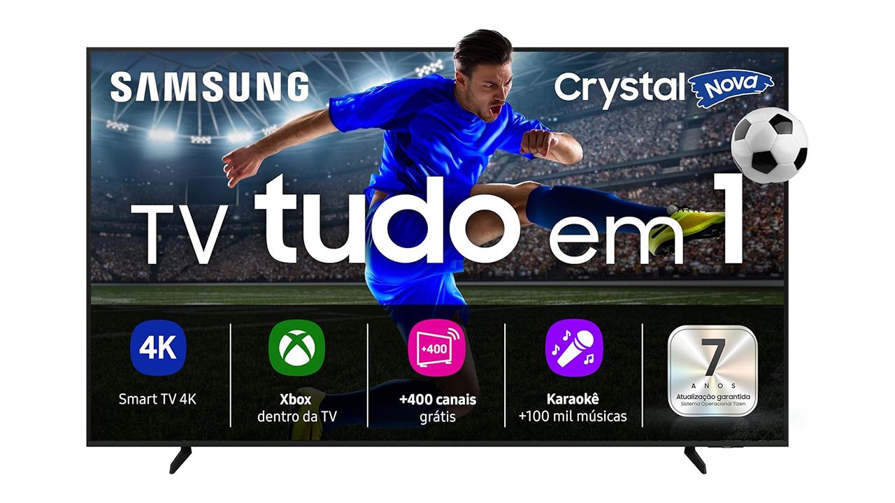 A TV também conta com suporte a HDR, que melhora contraste e níveis de brilho em cenas claras e escuras, e traz o sistema operacional Tizen com promessa de até sete anos de atualizações, um diferencial relevante dentro da categoria. A plataforma oferece acesso fácil aos principais aplicativos de streaming, além do Samsung TV Plus, com canais gratuitos, e do Gaming Hub, que permite jogar por nuvem usando serviços como Xbox Cloud Gaming e NVIDIA GeForce Now.