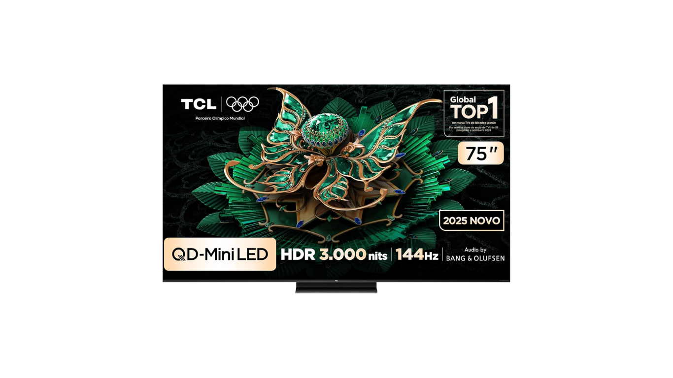 O topo de linha da TCL no Brasil em 2025. A 75C7K reúne o que há de mais avançado em tecnologia de imagem para telas grandes: painel QD-Mini LED com até 1.248 zonas de escurecimento local, brilho de pico de 3.000 nits e painel CrystGlow HVA com nanotecnologia biomimética inspirada nas asas de borboleta.