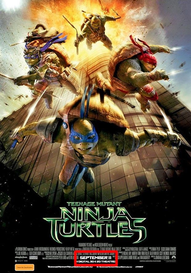 O pôster mostra Leonardo, Michelangelo, Donatello e Raphael pulando de um arranha-céu em chamas e traz a data 11 de setembro, dia em que o filme estreia na Australia, na parte inferior da imagem. Depois de muitas críticas, a imagem foi apagada.