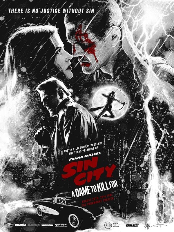 "Não há justiça sem pecado", diz um novo pôster de Sin City: A Dama Fatal. O film noir estilizado dirigido por Frank Miller e Robert Rodriguez ganhou este novo cartaz para promover a première do filme que será realizada no dia 20 de agosto na Austin Film Society, no estado americano do Texas. A associação foi criada pelo cineasta Richard Linklater para promover o cinema independente e conta com membros como Guillermo del Toro e Quentin Tarantino.