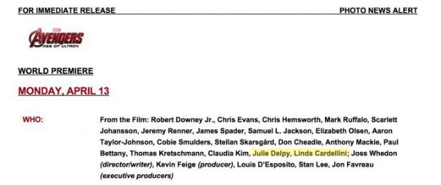 Mas os roteiristas acreditam que existe espaço para mais nomes nesta trama. Em um comunicado de imprensa sobre a pré-estreia mundial de Vingadores 2, a Marvel divulgou a lista do elenco presente, incluindo Julie Delpy (Antes da Meia Noite, O Verão do Skylab) e Linda Cardellini (das séries ER, Mad Men e Bloodline). Os produtores confirmaram que isto não é um erro: as duas atrizes estão presentes no filme, mas os seus papéis permanecem secretos.