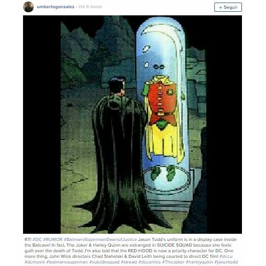 Como a postagem do Instagram abaixo mostra, o site soltou um combo de rumores: a imagem mostra o Batman contemplando o uniforme de Jason Todd, segundo alterego do Robin. Segundo consta, uma cena igual a essa imagem estará em Batman Vs Superman - A Origem da Justiça, como um easter egg de sua participação em Esquadrão Suicida. O principal indício é um detalhe de sua trama: o Coringa (Jared Leto) e a Arlequina (Margot Robbie) estarão nas mãos do Governo por causa da morte do jovem herói.