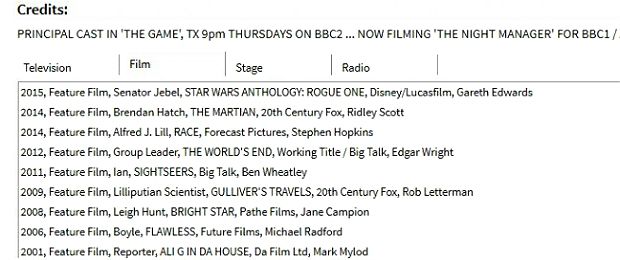 Algum profissional ou fonte do BBC News notou a inclusão do primeiro spin-off da Antologia Star Wars na filmografia de Aris no Spotlight, plataforma utilizada por atores e agentes que se mostrou 100% precisa no Episódio VII da saga principal, O Despertar da Força. A base de dados ainda especifica que Jonathan Aris dará vida a Senador Jebel, personagem inédito no universo Star Wars.