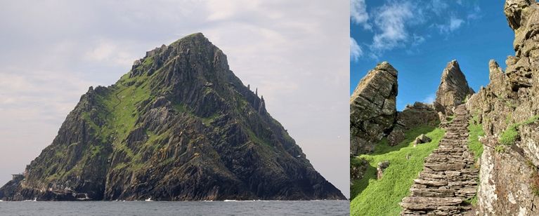 Skellig Michael / Sceilg Mhichíl (esse é o nome do local) tem as ruínas de um monastério cristão instalado em algum momento entre os séculos VI e VIII e abandonado no XII; e é Patrimônio Mundial da Unesco desde 1996. Operadores de turismo levam visitantes até lá via barco durante o verão. Passeios não são permitidos em dias de chuva ou muito vento, pois a escadaria de 600 degraus que leva ao topo é íngreme e escorregadia. Ninguém vive lá, então Skywalker ficou só-sozinho-alone-sem-ninguém-por-perto por anos. Haja Força!