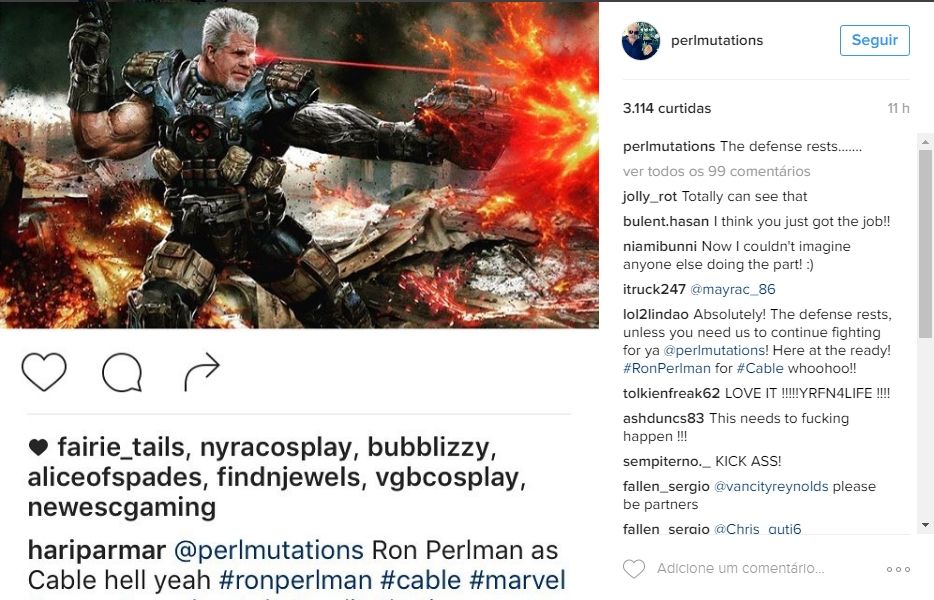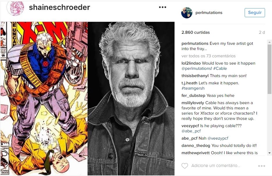 O ator publicou algumas imagens nas redes sociais com artes que mostrariam o quão adequado fisicamente ele seria para o papel. Em seguida, Perlman usou o Twitter para ponderar: "Na verdade, agora que eu pensei no assunto, Cable que deveria estar pedindo para ME interpretar, p*rra!".