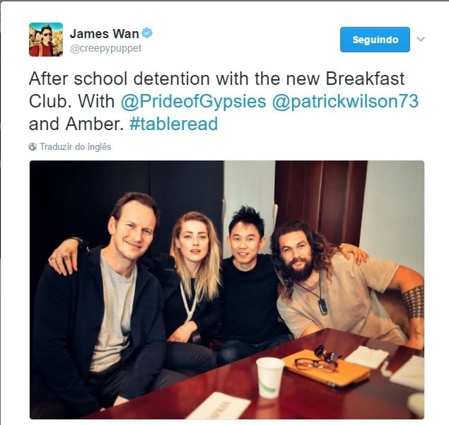 Como os gringos não têm carnaval, o ano oficialmente já começou para eles e é hora de trabalhar. O diretor James Wan postou a foto de uma leitura de roteiro com parte do elenco de Aquaman: o protagonista (Jason Momoa), sua amada Mera (Amber Heard) e o vilão Mestre do Oceano (Patrick Wilson).