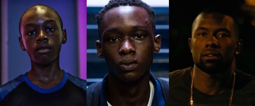 Little (Alex R. Hibbert) que vira Chiron (Ashton Sanders) que vira Black (Trevante Rhodes) em Moonlight.