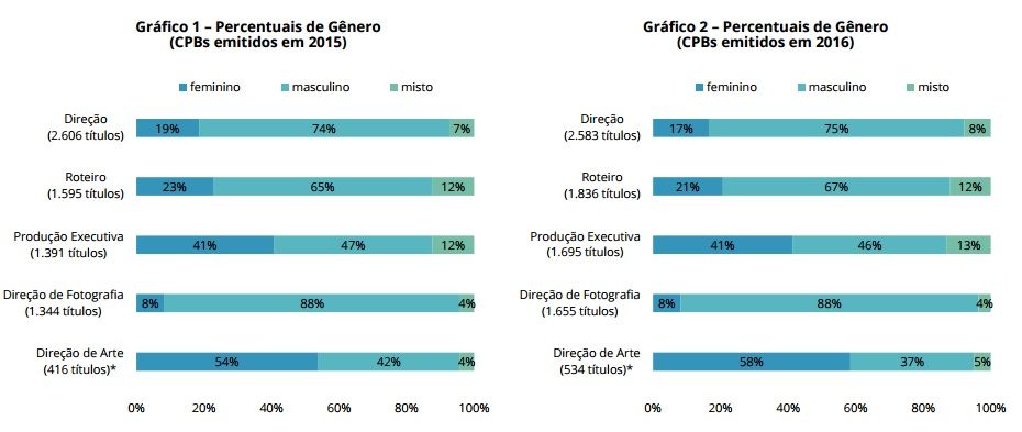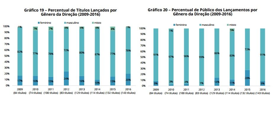 Tal conta leva em consideração filmes, videoclipes, programas de variedades e até reality-shows. Analisando apenas os filmes brasileiros lançados nos cinemas, 20% tiveram mulheres como diretoras. A porcentagem é das mais altas registradas desde 2009 e o pior ano para as mulheres definitivamente foi 2014, quando apenas 11 das 114 estreias tinham assinatura feminina.
