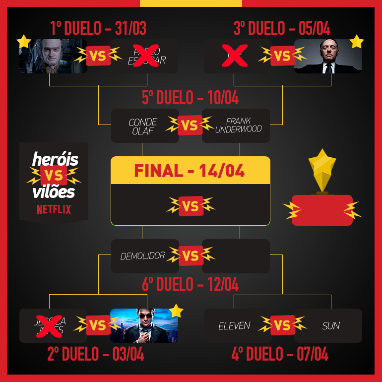 Já a vencedora da batalha entre Sun e Eleven enfrentará Demolidor (Charlie Cox) na disputa de heróis do próximo dia 12 - confira a chave atualizada abaixo! Essa treta chega ao fim em 17 de abril, quando sairá o o grande vencedor do VideoFight Heróis vs Vilões com personagens da Netflix!
