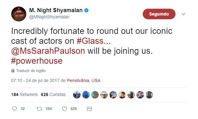 Finalmente multipremiada por seus trabalhos na TV, Sarah Paulson começa aos poucos a dar mais atenção ao cinema, aproveitando seu grande momento para conseguir espaço em projetos promissores. O próximo? Glass. O diretor M. Night Shyamalan anunciou no Twitter que a intérprete de Marcia Clark em American Crime Story estará em seu novo suspense, sequência de Fragmentado e Corpo Fechado.