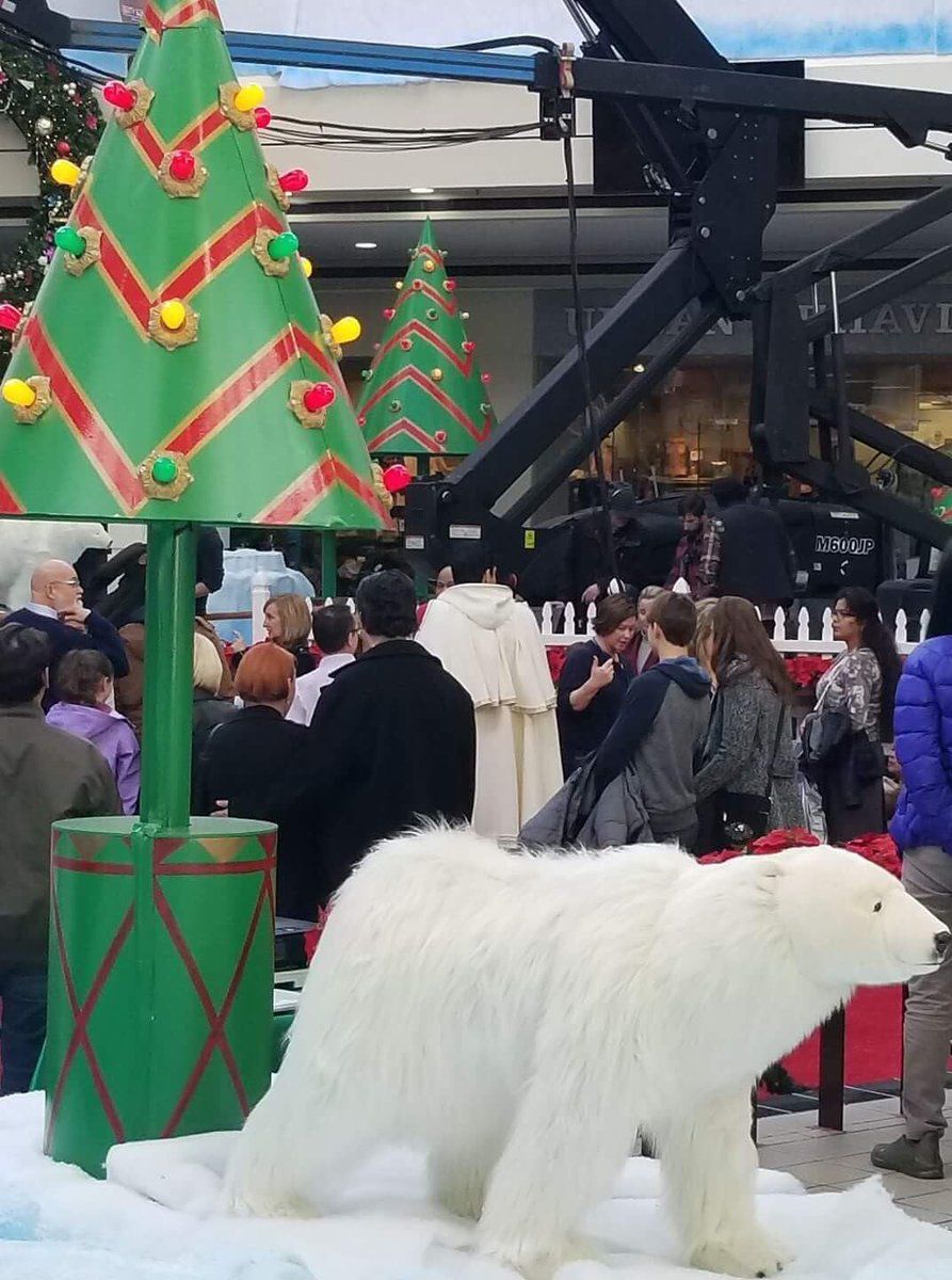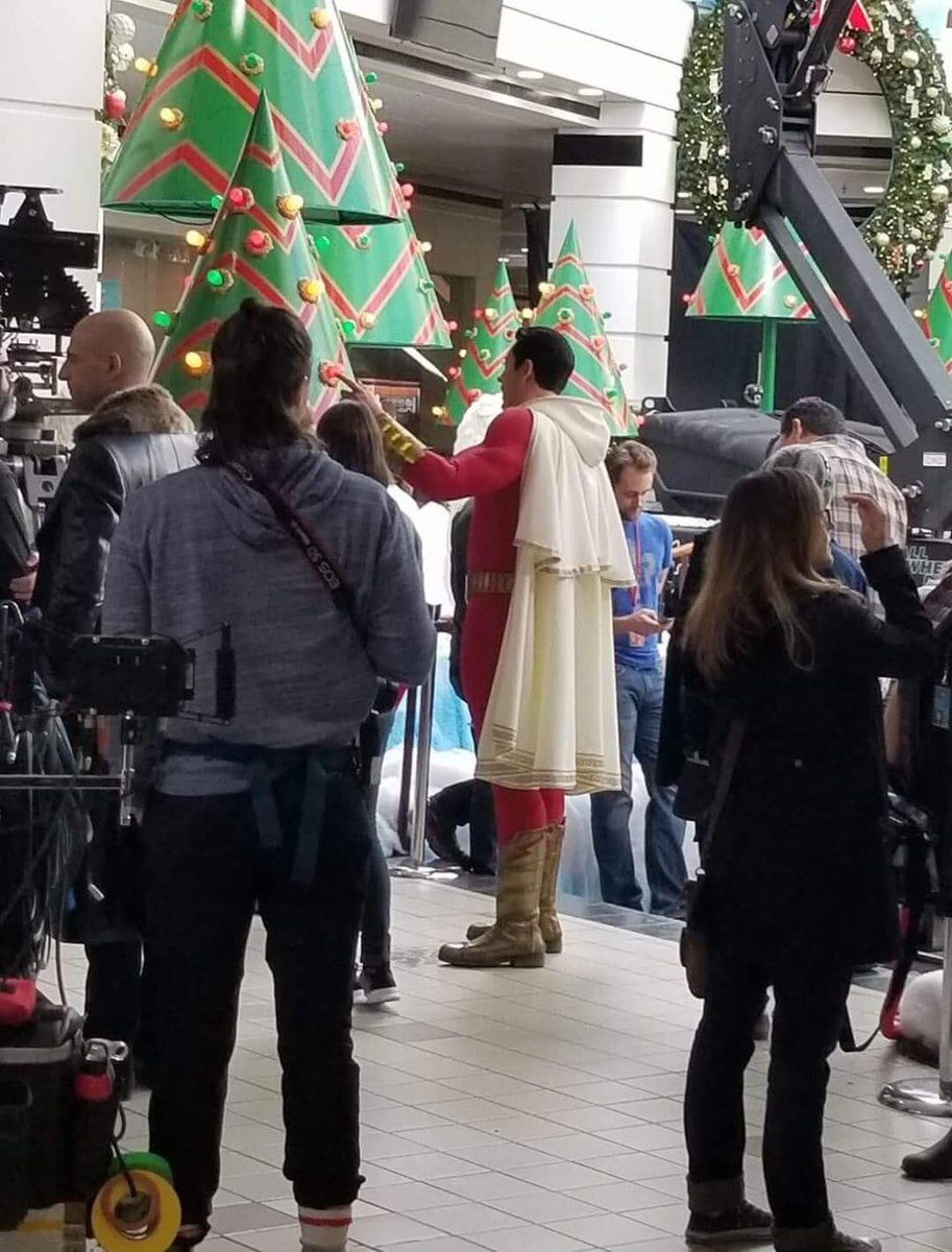 Em uma foto divulgada no Twitter (via ComicBook), vemos o personagem em um shopping com decoração natalina, onde Shazam provavelmente vai enfrentar o vilão Doutor Silvana, interpretado por Mark Strong — o ator pode ser visto no canto da imagem.