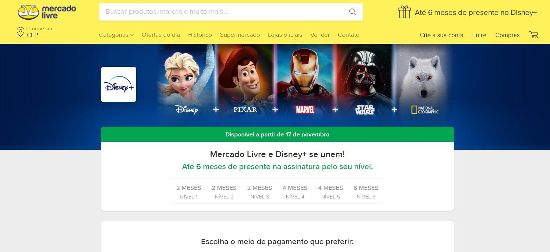 Usuários do Mercado Livre e Mercado Pago, por exemplo, poderão ter até seis meses grátis de Disney+ a depender de quantos "Mercado Pontos" possuem. Os pontos são acumulados conforme você faz compras ou utiliza o Mercado Pago. Se você é usuário do Mercado Livre há algum tempo e já comprou quaisquer coisas através do site, pode já ter pontos pendentes, o que lhe dá de um a seis meses gratuitos do Disney+.