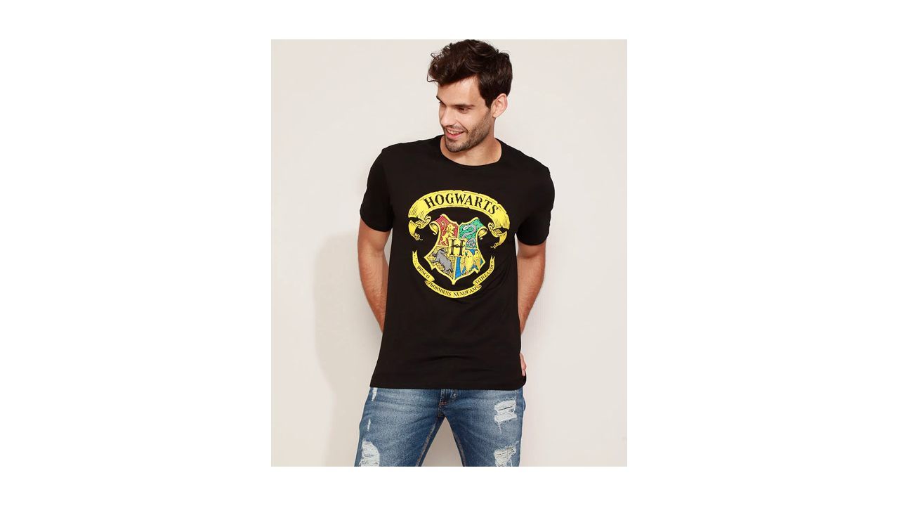 Desenvolvida em malha de algodão, a Camiseta Masculina de Manga Curta, C&A tem estampa temática do brasão que contempla as quatro Casas da saga. Perfeita para o dia a dia dos entusiastas do mundo fantástico de Hogwarts