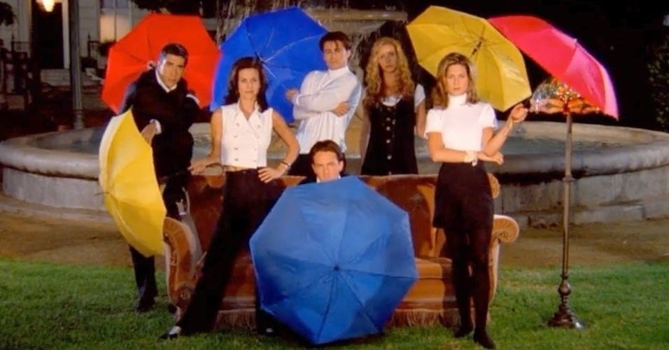 Por um breve momento, entre dois movimentos de dança, os seis atores se reúnem em torno de seu amado sofá e abrem seis guarda-chuvas coloridos ao mesmo tempo: dois vermelhos para Rachel e Ross (que logo se apaixonam), dois azuis para Chandler e Joey (que dividem o mesmo apartamento por um longo tempo) e dois amarelos para Monica e Phoebe.