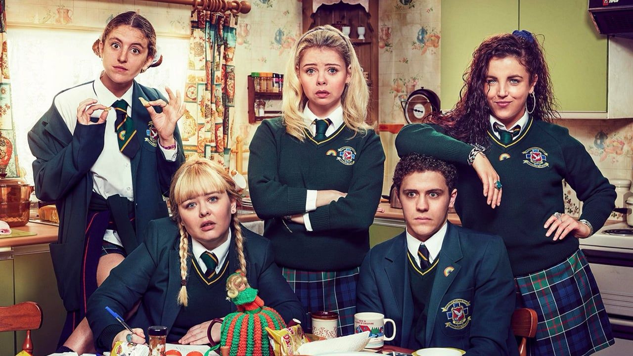 Por um lado, Derry Girls funciona principalmente como uma série de comédia. O foco está em quatro alunas e um aluno de uma escola católica na Irlanda do Norte que, no estilo típico de uma sitcom, tropeçam de uma gafe para outra e não estão isentos de qualquer constrangimento.