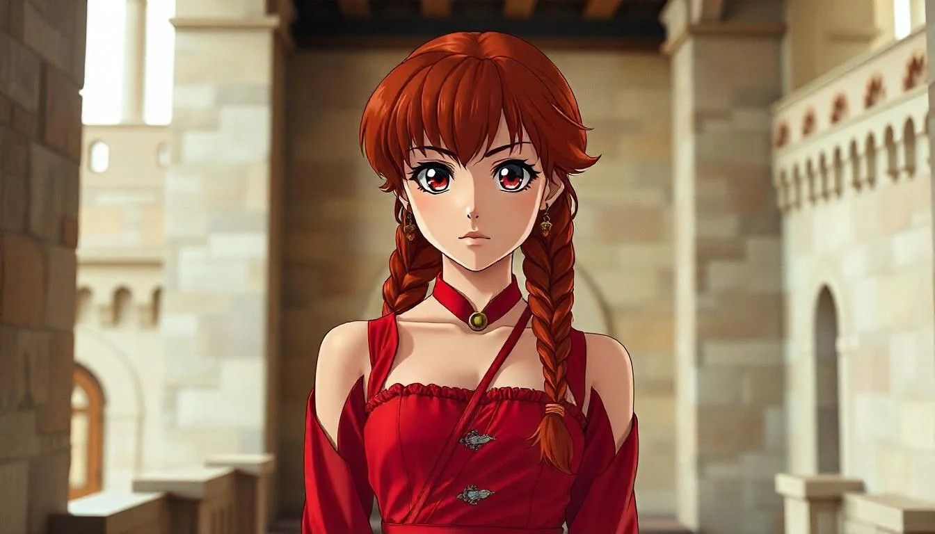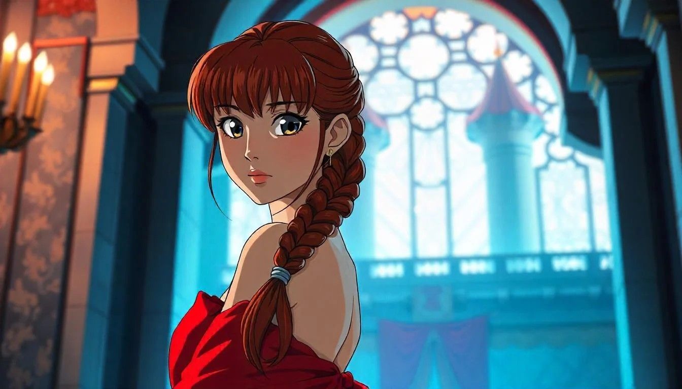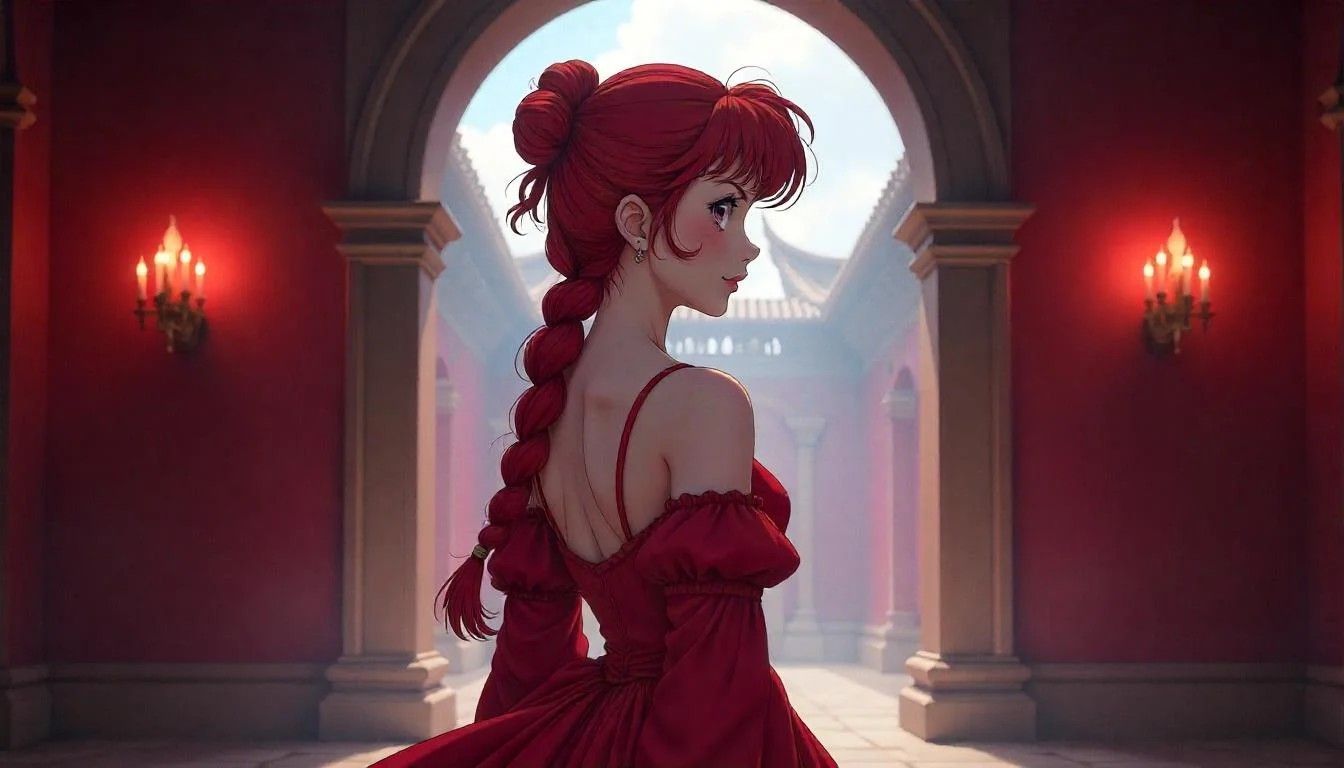 Com seu vestido vermelho de ombros caídos, a princesa Ranma visitaria outra das icônicas princesas de cabelos vermelhos da Disney: Ariel. Sabemos que ela está dentro do castelo da Pequena Sereia por causa da grande janela ao fundo que revela um par de torres com aquelas inesquecíveis flâmulas.
