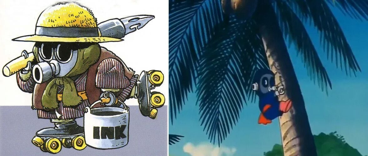 Este personagem apareceu algumas vezes em Dr. Slump, uma comédia slice of life que o mangaká criou antes de Dragon Ball, e tem a aparência de um pequeno robô com uma máscara de gás. Foi assim que Toriyama se desenhou no mangá para falar com os leitores, e também já foi visto diversas vezes no anime, seja em cartazes onde são oferecidas recompensas para ele ou como plateia nos torneios.