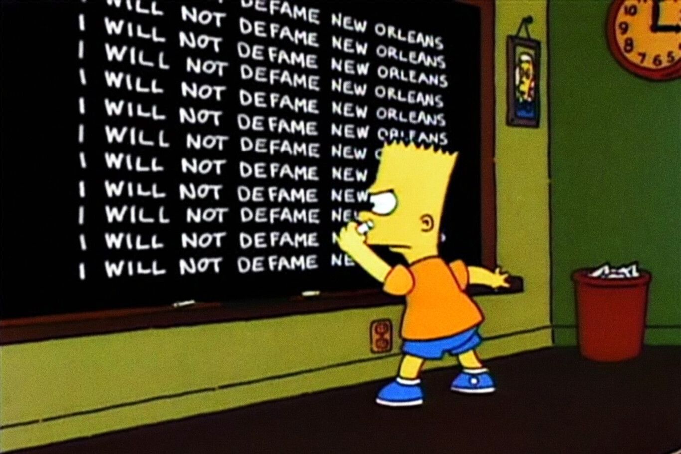Não foi o único pedido de desculpas que eles receberam. No capítulo seguinte, "Homer the Heretic", podemos ver Bart escrevendo na lousa: "Não vou caluniar New Orleans". E Bart estava certo em fazê-lo, mesmo não sendo o responsável pela afronta desta vez, como Mike Reiss relembrou no livro "Springfield Confidential: Jokes, Secrets, and Outright Lies from a Lifetime Writing for The Simpsons": "Um jornalista de New Orleans me ligou e disse: 'Quando seu amigo Bart aparecer aqui, vamos matá-lo'. Eu expliquei: 'Bem, você sabe que não será realmente o Bart. Será apenas um homenzinho em um traje de espuma'. O jornalista respondeu: 'Tanto faz. Vamos matá-lo'. Eles provavelmente o fariam", lembrou o escritor.