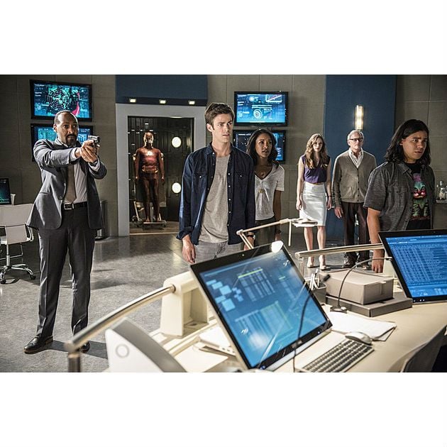 A imagem mostra os mocinhos da trama - Barry (Grant Gustin), Joe (Jesse L. Martin), Iris (Candice Patton), Caitlin (Danielle Panabaker), Dr. Stein (Victor Garber) e Cisco (Carlos Valdes) - olhando assustados para alguém que, provavelmente, não foi convidado para esta pequena reunião. E a situação não parece ser das mais pacíficas, afinal Joe está apontando sua arma para a tal figura.