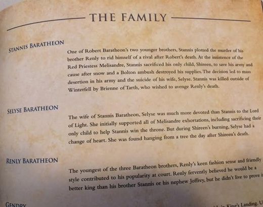 “Um dos dois irmãos mais novos de Robert Baratheon, Stannis arquitetou a morte do irmão Renly para se livrar do rival após a morte de Robert. Com a insistência da Sacerdotisa Vermelha, Melisandre, Stannis sacrificou sua única filha, Shireen, para salvar seu exército e sua causa após uma tempestade de neve e uma emboscada dos Bolton terem destruído seus suprimentos. A decisão levou à deserção em massa do seu exército e ao suicídio de sua esposa, Selyse. Stannis foi morto nos portões de Winterfell por Brienne de Tarth, que buscava vingança pela morte de Renly.”