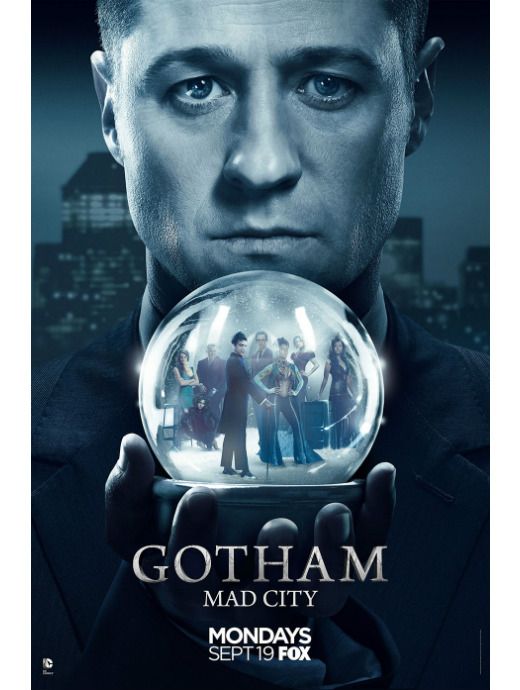 Gordon (Ben McKenzie) tem os vilões em suas mãos em belo cartaz da terceira temporada de Gotham. Os personagens que ele vê dentro da bola de cristal fazem jus à frase que acompanha a arte: "Cidade Louca". Confira: