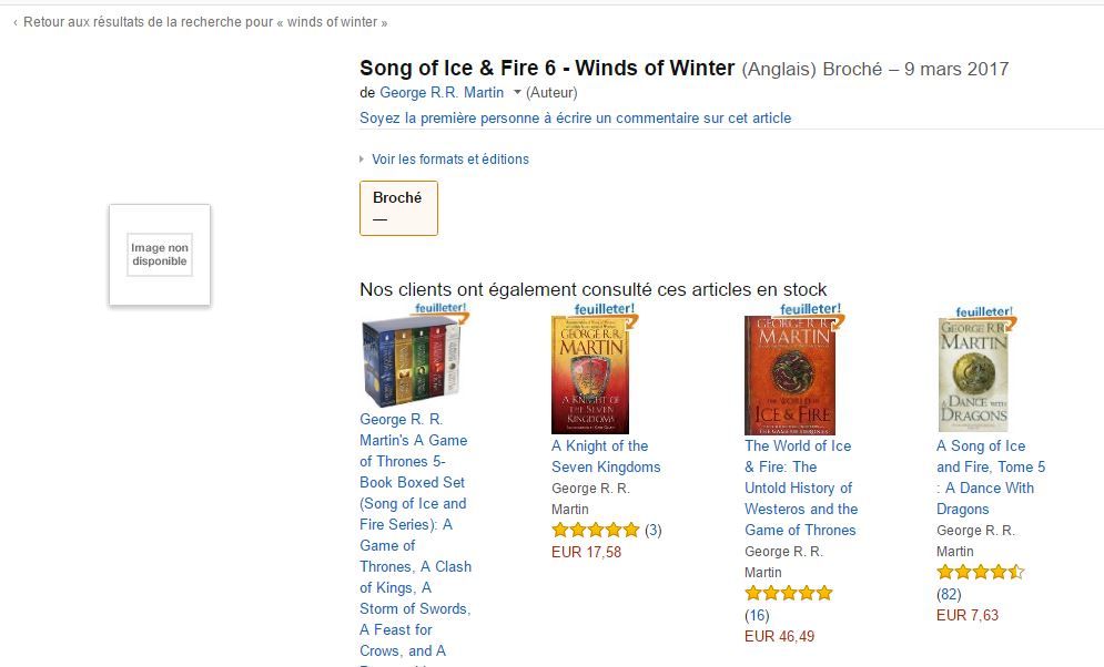 Sexto livro da saga As Crônicas de Gelo e Fogo, The Winds of Winter já foi bastante adiado, mas pode ser que George R.R. Martin esteja enfim terminando de escrevê-lo. Uma página do site de compras Amazon na França aponta para o lançamento da obra, em inglês, no dia 9 de março de 2017.