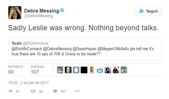 Porém, a eterna Grace Debra Messing usou suas redes sociais para negar tal informação. Ela avisou que Leslie está errado, mas confirmou que há conversas sobre o tal projeto. A NBC ainda não falou oficialmente sobre o assunto.