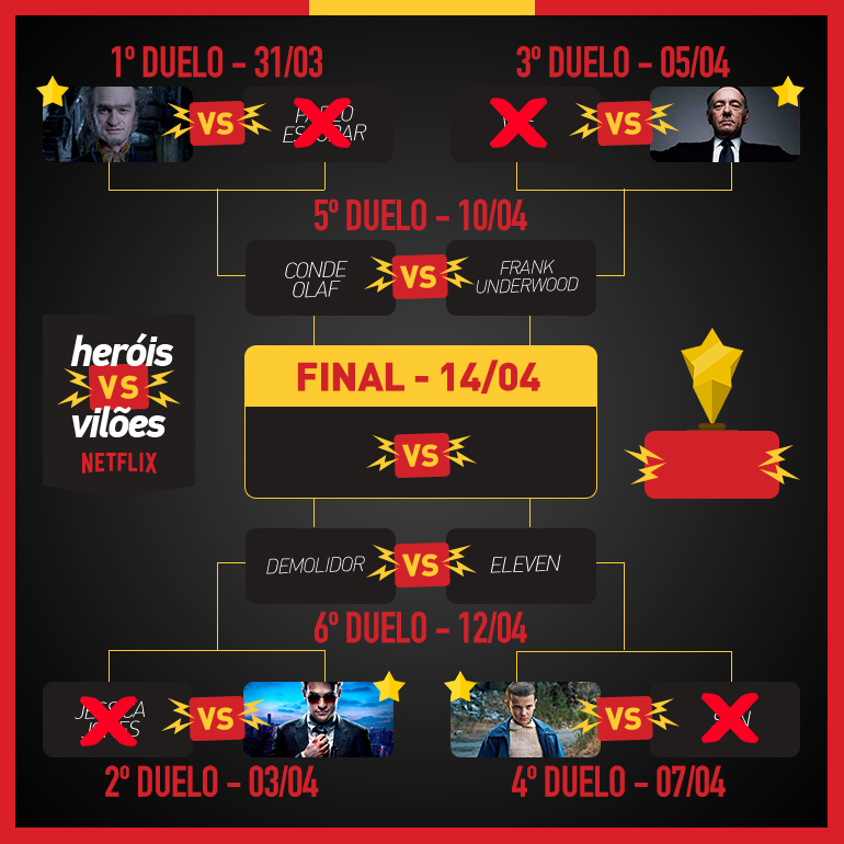 O vencedor deste 5º duelo garante a vaga da chave dos vilões no nosso confronto final, que acontecerá dia 14 de abril. O grande vencedor do VideoFight Heróis vs Vilões com personagens da Netflix sai no dia 17 de abril.