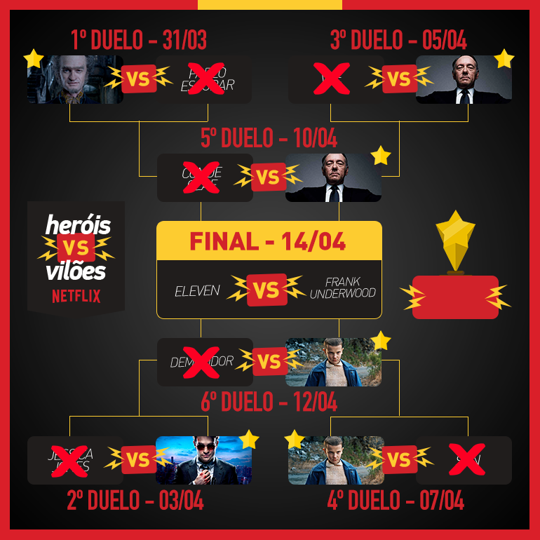 O grande vencedor do VideoFight Heróis vs Vilões com personagens da Netflix sairá no dia 17 de abril! Quem ganha sua torcida? Relembre toda essa emocionante disputa na chave atualizada abaixo!