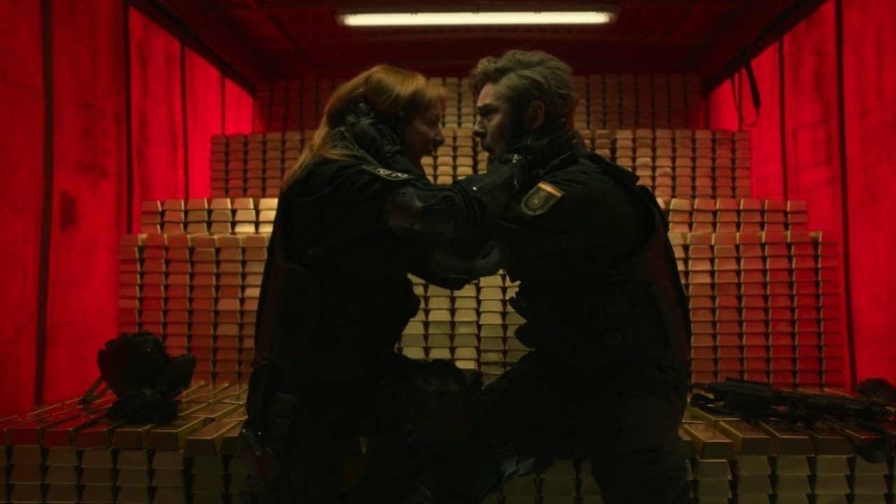 Voltando ao tempo presente: depois de executarem um plano super elaborado para roubar o ouro, a gangue finalmente consegue tirá-lo de dentro do Banco da Espanha e despistar o comando de Tamayo (Fernando Cayo). No entanto, enquanto se preparam para fugir com as barras, são surpreendidos por um esquadrão policial e aí vem a reviravolta: o flagrante foi falso e os supostos policiais eram, na verdade, Rafael e Tatiana.