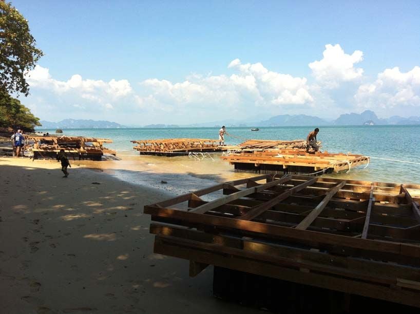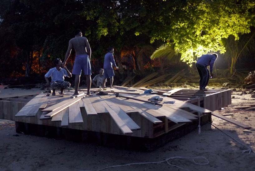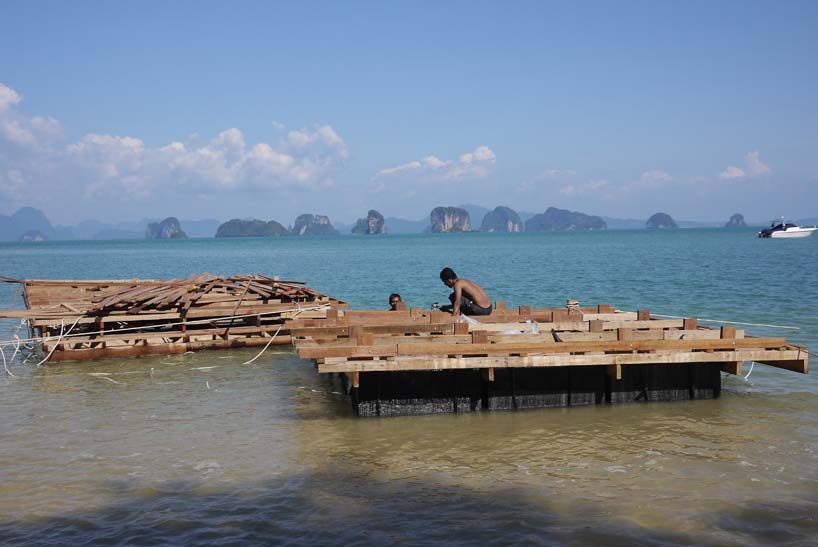 Sob orientação do arquiteto Ole Scheeren, os pescadores usaram técnicas de montagem de embarcações para fazer os módulos que compuseram o auditório flutuante.