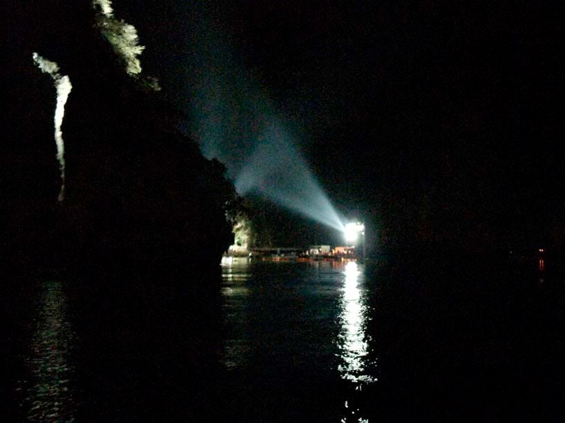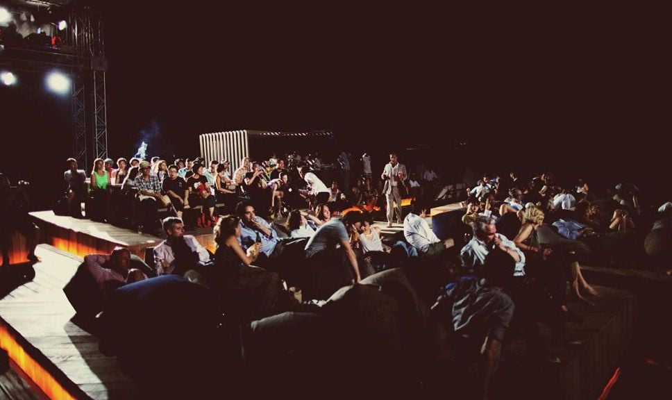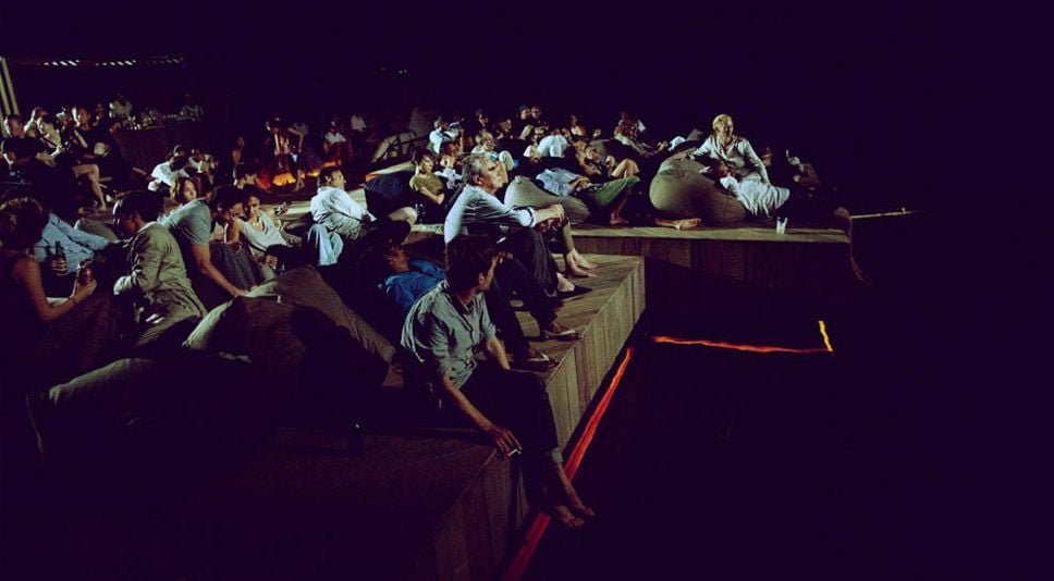 Como a sala de cinema estava localizada ao ar livre, a exibição do filme tinha que ser feita após o pôr do sol, o que dá ainda mais charme à instalação de Scheeren. Mas aí você pensa: e o som, é prejudicado? Não, porque mesmo a mar aberto dois paredões de rochas da ilha criavam uma espécie de câmara acústica natural, que não deixam o som se discipar facilmente.