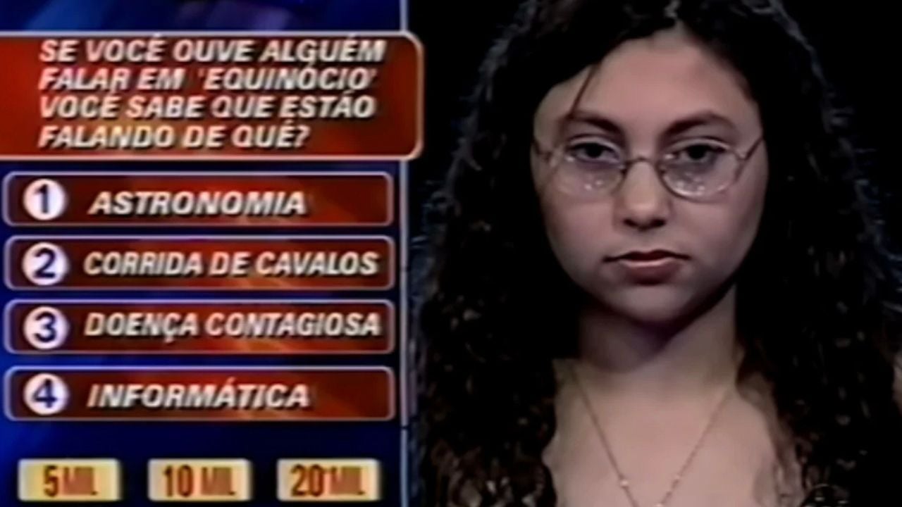Quando questionada sobre o significado da palavra "equinócio" - que se refere a um fenômeno astronômico -, a participante se confundiu. Ela comparou a palavra a "equino, cavalo", e acabou marcando a opção "2 - Corrida de cavalos". Um erro inocente, claro, mas que deve tê-la deixado muito brava depois.